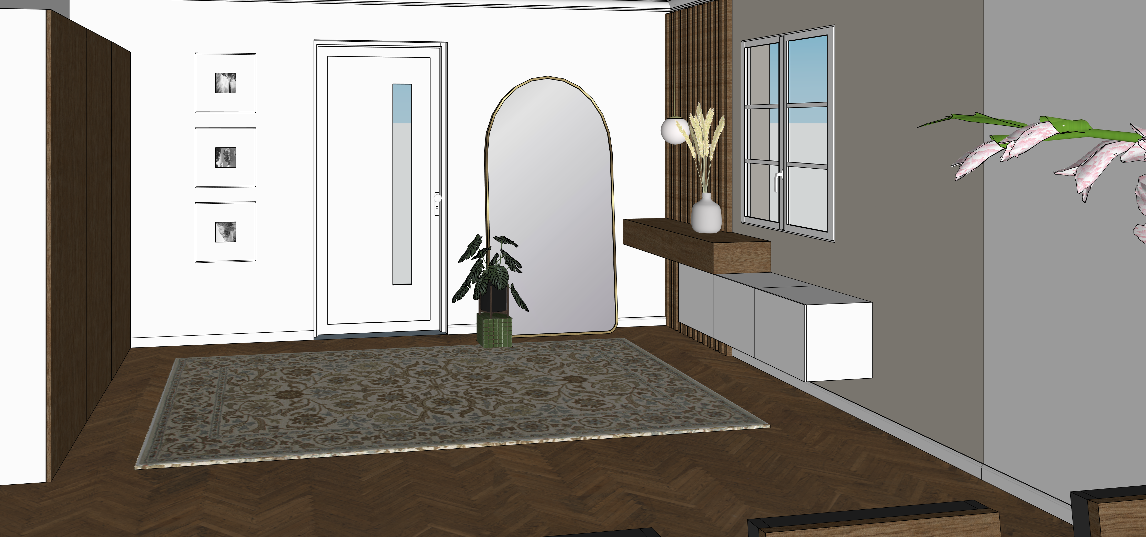 Bien que MNML.AI produise des images rapidement et sans effort, l’outil montre des limites importantes dès qu’il s’agit de respecter fidèlement le projet modélisé. Sur les rendus obtenus, plusieurs éléments sont réinterprétés : les meubles changent de forme ou de finition, la porte n’est pas reproduite correctement et les reflets dans les miroirs ne correspondent pas à la réalité de la scène SketchUp.
