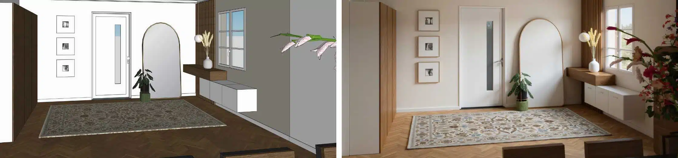 Bien que MNML.AI produise des images rapidement et sans effort, l’outil montre des limites importantes dès qu’il s’agit de respecter fidèlement le projet modélisé. Sur les rendus obtenus, plusieurs éléments sont réinterprétés : les meubles changent de forme ou de finition, la porte n’est pas reproduite correctement et les reflets dans les miroirs ne correspondent pas à la réalité de la scène SketchUp.