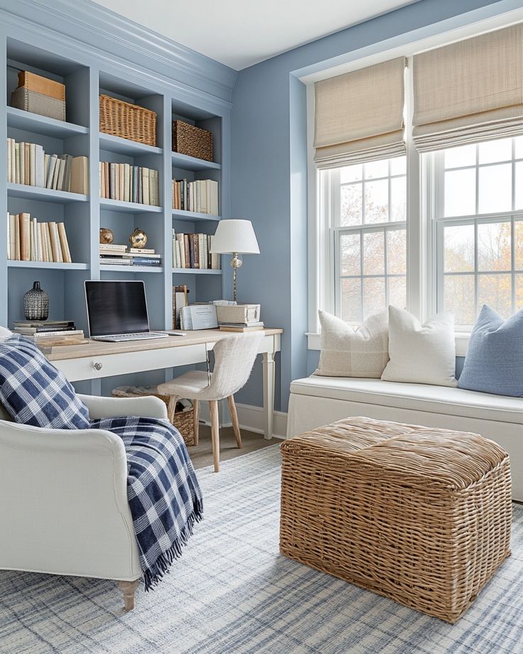 Dans une chambre, le baby blue favorise le repos et la détente. Il fonctionne très bien sur les murs, mais aussi par touches, à travers le mobilier ou les accessoires. Dans un bureau, il aide à instaurer une atmosphère propice à la concentration et à la créativité.