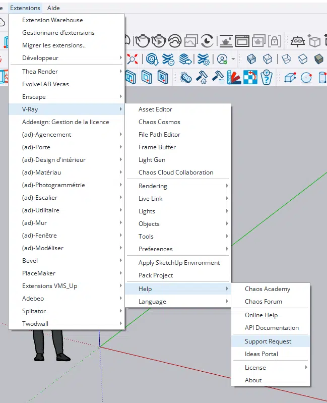 - Dans SketchUp, cliquez sur Extension > V-Ray > Help > Support Request.