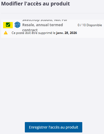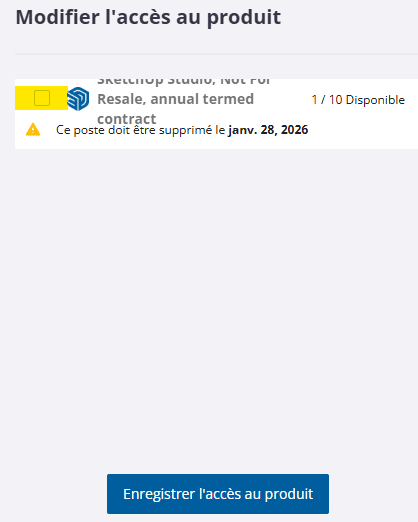 - Pour révoquer une licence une licence à un utilisateur cliquer sur les 3 points à droite du nom de l’utilisateur puis sur « Modifier l’accès au produit », décocher la case et valider la manipulation en cliquant sur « Enregistrer l’accès au produit »