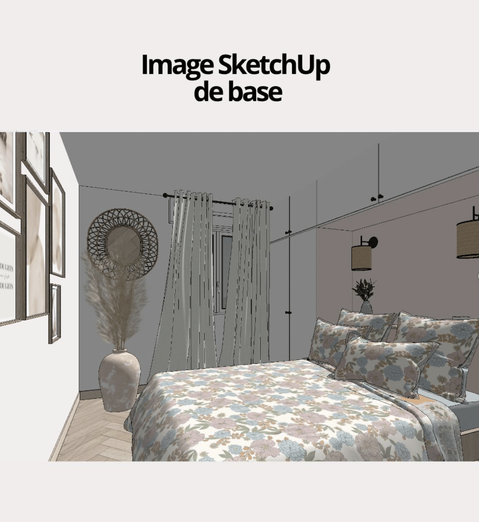 Point de départ : une modélisation SketchUp d’une chambre, non rendue. Sans lumière avancée, sans textures travaillées.