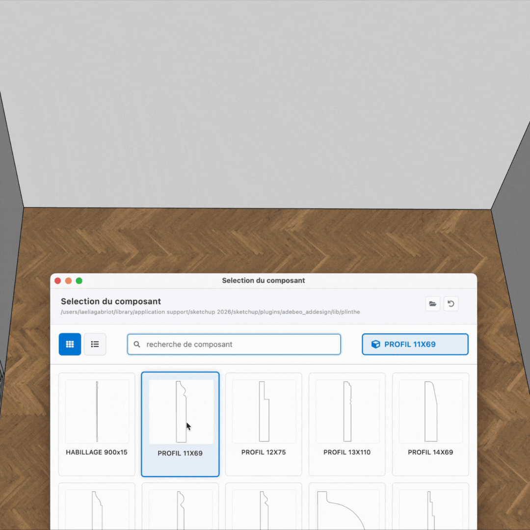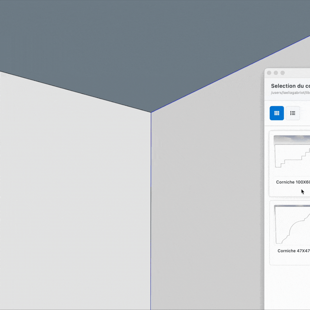 - Sélectionnez un profil dans la bibliothèque.Vous pouvez choisir une plinthe, une corniche ou une cimaise parmi les profils proposés, ou même un profil personnalisé si vous en avez créé un.